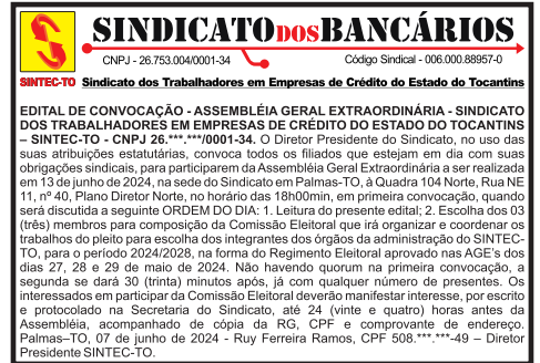 O Sindicato dos Bancários do Tocantins, no uso das suas atribuições estatutárias, convoca todos os filiados que estejam em dia com suas obrigações sindicais, para participarem da Assembleia Geral Extraordinária a ser realizada em 13 de junho de 2024, na sede do Sindicato em Palmas-TO, na Quadra 104 Norte, Rua NE 11, no 40, Plano Diretor Norte, no horário das 18h, em primeira convocação, quando será discutida a seguinte ORDEM DO DIA: