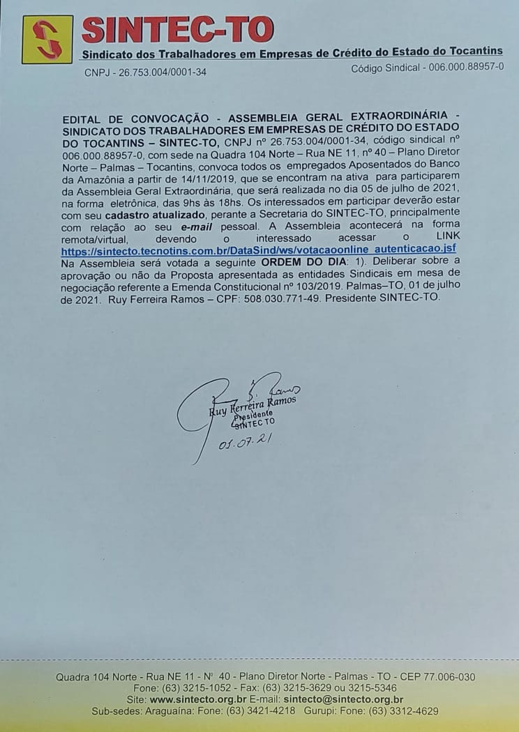 O Sindicato dos Bancários do Tocantins (Sintec-TO) convoca todos os empregados do Banco da Amazônia aposentados a partir de 14/11/2019 e, que se encontram na ativa, para participar de Assembleia Extraordinária para deliberação de “Aprovação ou não Aprovação” da Proposta apresentada as entidades Sindicais em mesa de Negociação referente Emenda Constitucional nº 103/2019 .