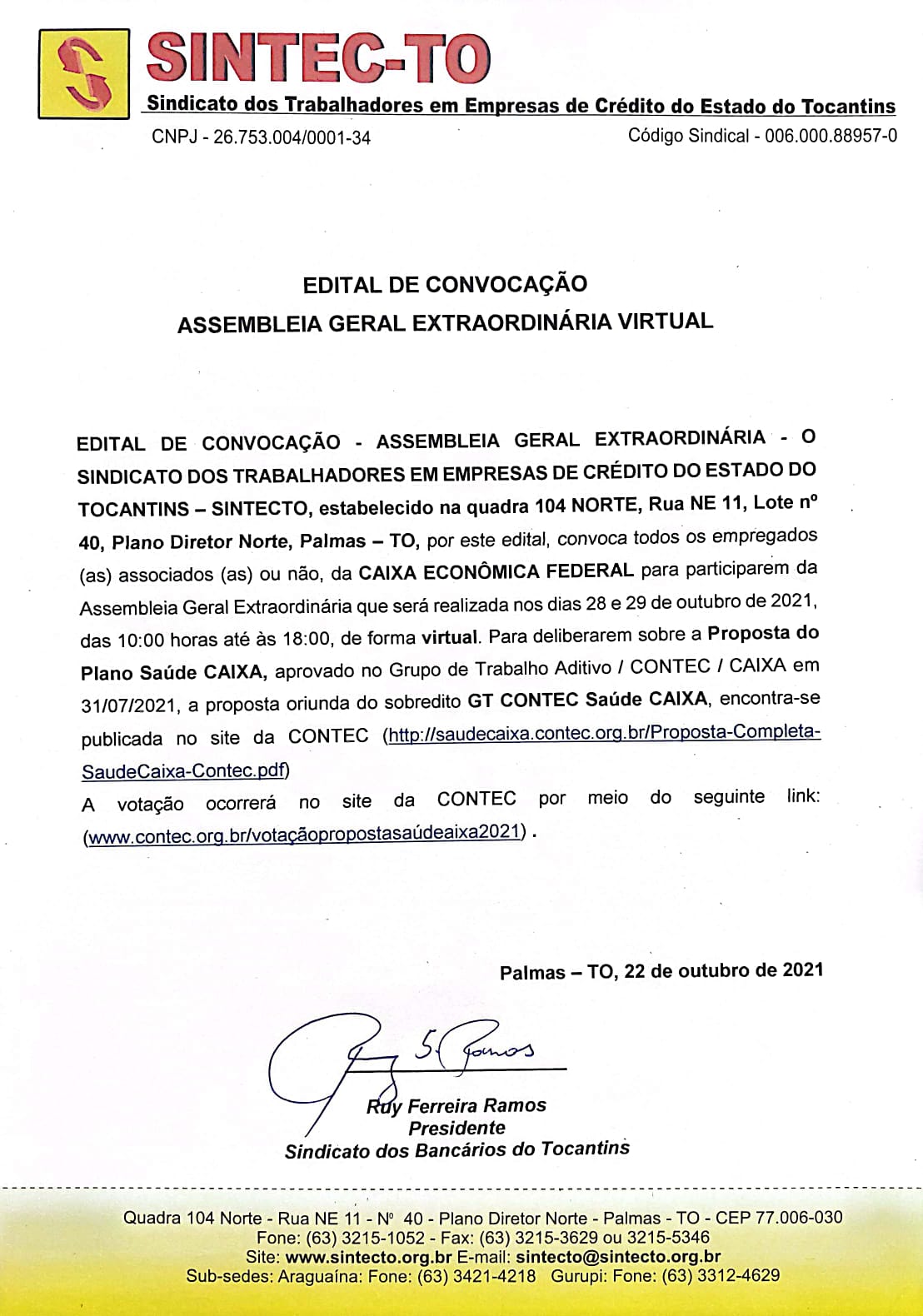 O Sindicato dos Bancários do Tocantins (Sintec-TO) convoca todos os empregados (as) associados (as) ou não, da CAIXA ECONÔMICA FEDERAL para participarem da Assembleia Geral Extraordinária que será realizada nos dias 28 e 29 de outubro de 2021, das 10 até às 18 horas, de forma virtual, para deliberarem sobre a Proposta do Plano Saúde CAIXA, aprovado no Grupo de Trabalho Aditivo / CONTEC / CAIXA em 31/07/2021.