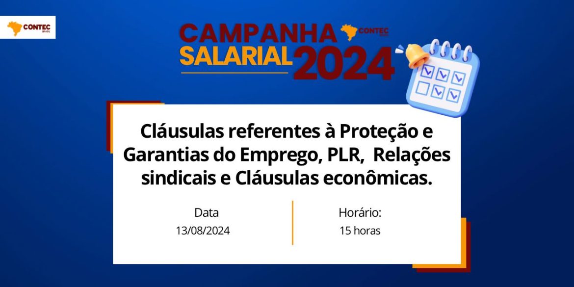 A próxima reunião de negociação entre a Confederação Nacional dos Trabalhadores nas Empresas de Crédito (CONTEC) e a Federação Nacional dos Bancos (FENABAN) será realizada nesta terça-feira (13) às 15h. A reunião trará como discussão cláusulas econômicas, PLR, relações sindicais, e questões relacionadas à proteção e garantias de emprego.