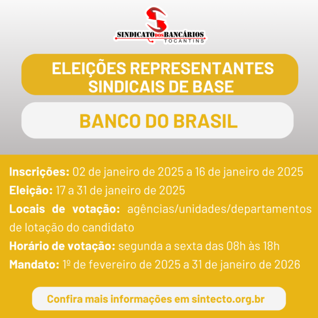 A Comissão Eleitoral, designada pelo presidente do Sindicato dos Bancários do Tocantins, Ruy Ferreira Ramos, através da portaria: 003/2024, convoca todos os funcionários da Banco do Brasil, na base territorial no Estado do Tocantins, para as eleições de Representante Sindical de Base, conforme Anexo IV, Artigos 1 ao 13 e seus Parágrafos e Letras –…