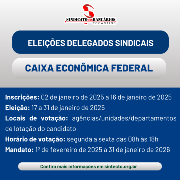 A Comissão Eleitoral, designada pelo presidente do Sindicato dos Bancários do Tocantins, Ruy Ferreira Ramos, através da portaria: 002/2024, convoca todos os funcionários da Caixa Econômica Federal, na base territorial no Estado do Tocantins, para as eleições de Delegado Sindical, conforme Cláusula 46 – Anexo I DO REGULAMENTO, Capítulos I ao VI – Artigos 1°…