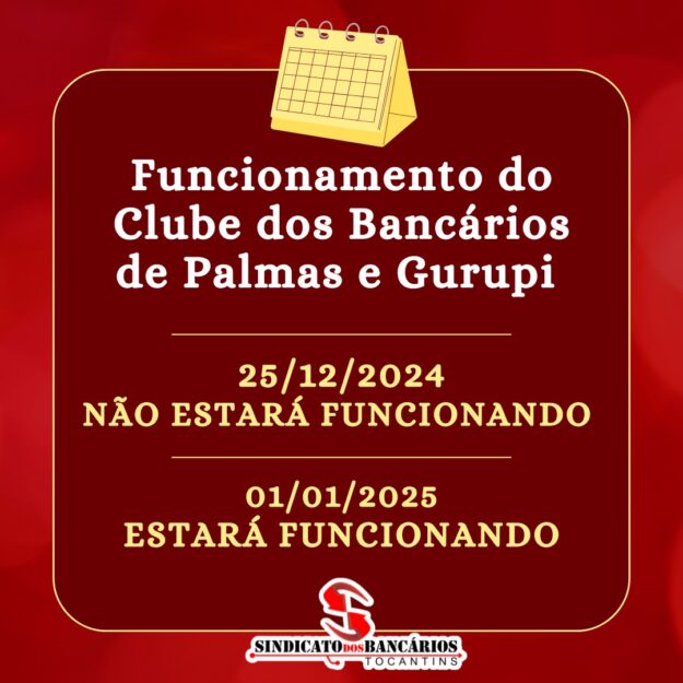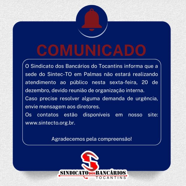 O Sindicato dos Bancários do Tocantins informa que a sede em Palmas não realizará atendimento ao público nesta sexta-feira, 20 de dezembro, devido reunião de organização interna. Caso precise resolver alguma demanda de urgência, envie mensagem aos diretores. Presidente: Ruy Ramos Telefone: (63) 98454-1832 Secretária Geral: Alessandra de Paula Carvalho Telefone: 98473-8497 Diretora Financeira: Erizete…