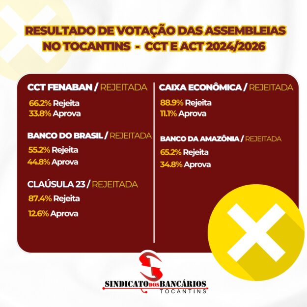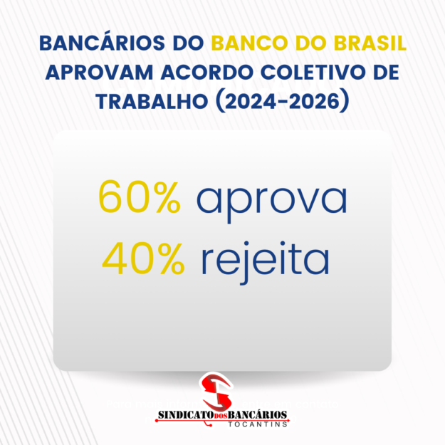 Os bancários dos bancos privados do Tocantins aprovaram a Convenção Coletiva de Trabalho (CCT) para o biênio 2024-2026, com 77,10% dos votos a favor e 22,9% contrários. A votação foi realizada nesta segunda-feira, das 10h às 17h, de forma online para os bancários filiados e presencial para os não filiados conforme apresentado em edital.