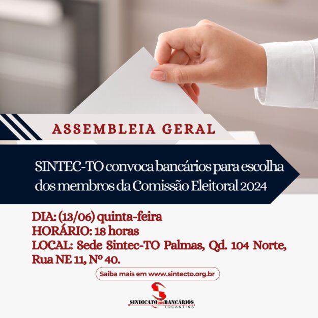 Em cumprimento ao Regimento do Processo Eleitoral, foram eleitos nesta quinta-feira, 13 de junho, os membros da Comissão Eleitoral 2024. A Assembleia Geral Extraordinária foi realizada nesta data(13/06), na sede do Sindicato dos Bancários do Tocantins, em Palmas-TO, com primeira chamada às 18 horas e com segunda chamada às 18h30. Confira os nomes para Comissão Eleita:…