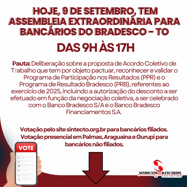 Os bancários e bancárias do Bradesco no Tocantins aprovaram, com 93,75% dos votos, o Acordo Coletivo de Trabalho (ACT) que reconhece e valida o Programa de Participação nos Resultados (PPR) e o Programa de Resultado Bradesco (PRB), referentes ao exercício de 2025, incluindo a autorização do desconto a ser efetuado em função da negociação coletiva,…