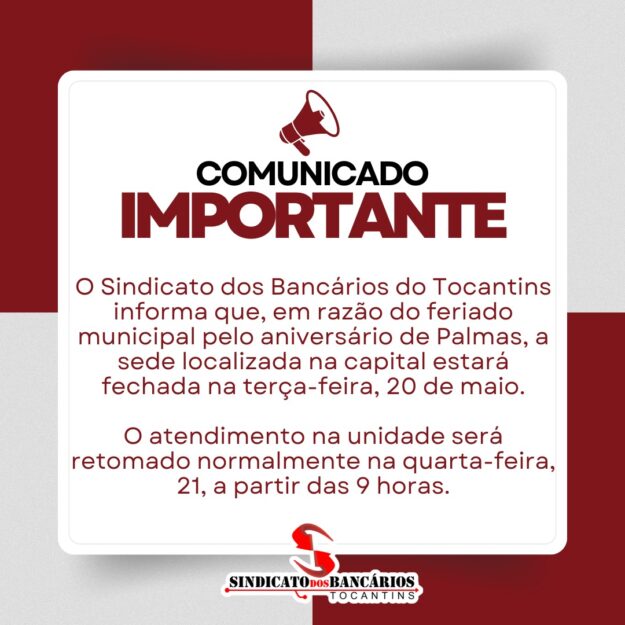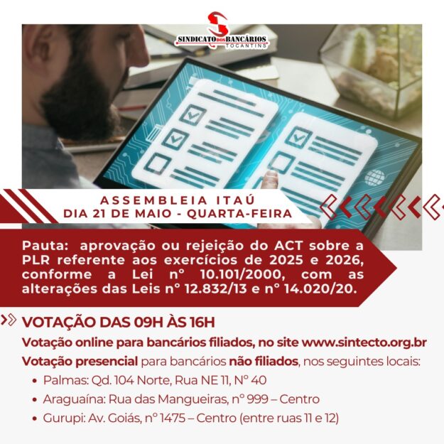 O Sindicato dos Bancários do Tocantins (SINTEC/TO) convoca todos os bancários do Banco Itaú Unibanco S.A., lotados em sua base territorial, para participarem da Assembleia Geral Extraordinária que ocorrerá na próxima quarta-feira, 21 de maio de 2025, das 9h às 16h. A assembleia terá duas modalidades de participação: A pauta da assembleia trata da aprovação…