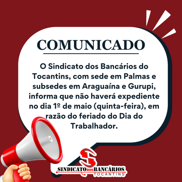 O Sindicato dos Bancários do Tocantins, com sede em Palmas e subsedes em Araguaína e Gurupi, informa que não haverá expediente no dia 1º de maio (quinta-feira), em razão do feriado do Dia do Trabalhador. Todas as unidades permanecerão fechadas durante o feriado. Os atendimentos serão retomados normalmente na sexta-feira, 2 de maio, das 9h…