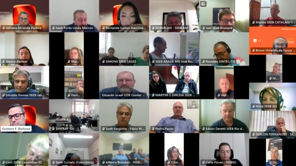 A reunião foi coordenada por Eduardo Israel, diretor da FEEB SC. O banco foi representado por Gustavo, Fernanda, Bruno, Adriana e Guermandi.