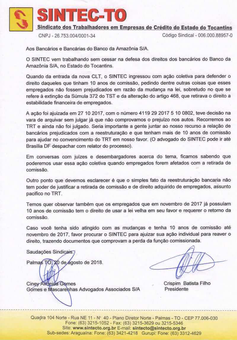 O Sindicato dos Bancários-SINTECTO comunica e convida aos empregados do Banco da Amazônia que sofreram mudança ou perda de Comissão/Função Gratificada, e que estiveram na Função por mais de 10 anos, que procurem o Sindicato, com documentação em mão, para entrarmos com Ação Individual para recondução ou incorporação da Função.