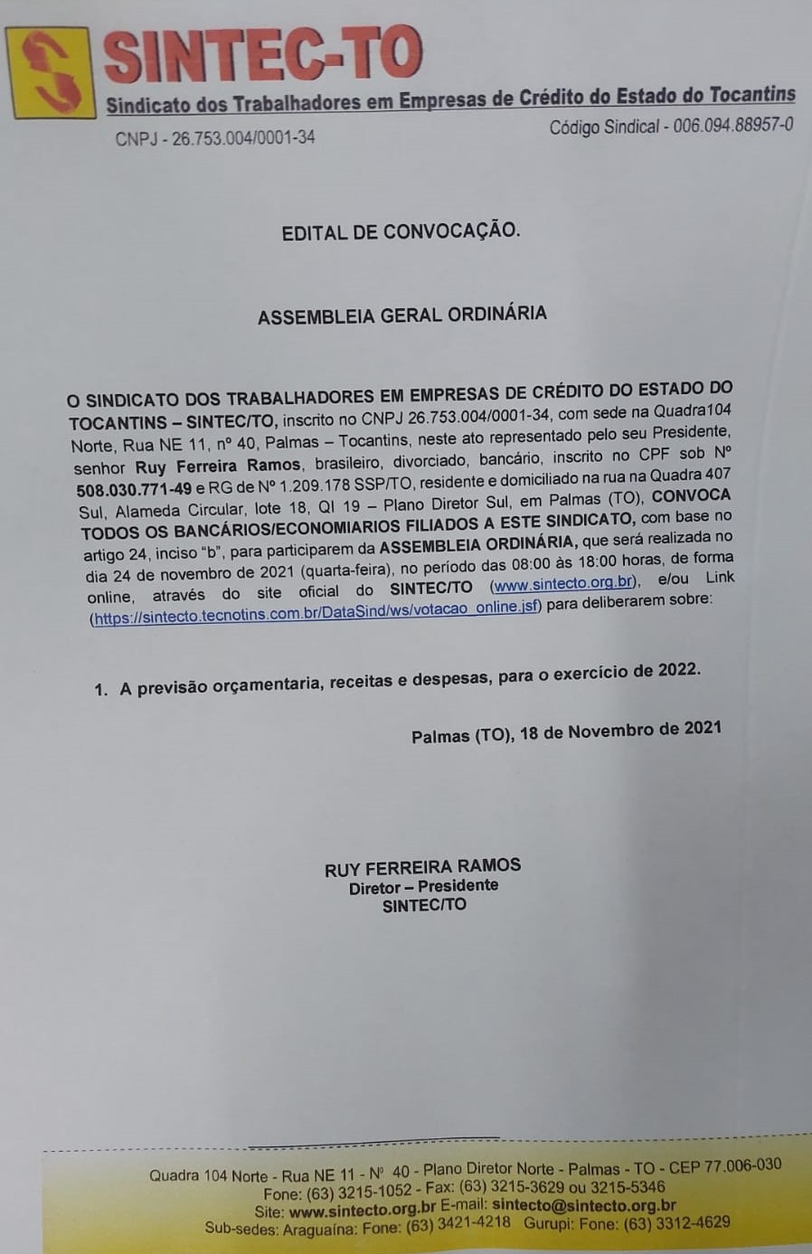 O Sindicato dos Bancários do Tocantins(Sintec/to), convoca todos os bancários/economiários filiados ao sindicato, com base no artigo 24, inciso “b”, para participarem da ASSEMBLEIA ORDINÁRIA, que será realizada no dia 24 de novembro de 2021 (quarta-feira), no período das 08:00 às 18:00 horas, de forma online, através do site oficial do SINTEC/TO (www.sintecto.org.br) ou link (https://sintecto.tecnotins.com.br/DataSind/ws/votacao_online.jsf) para deliberarem sobre: