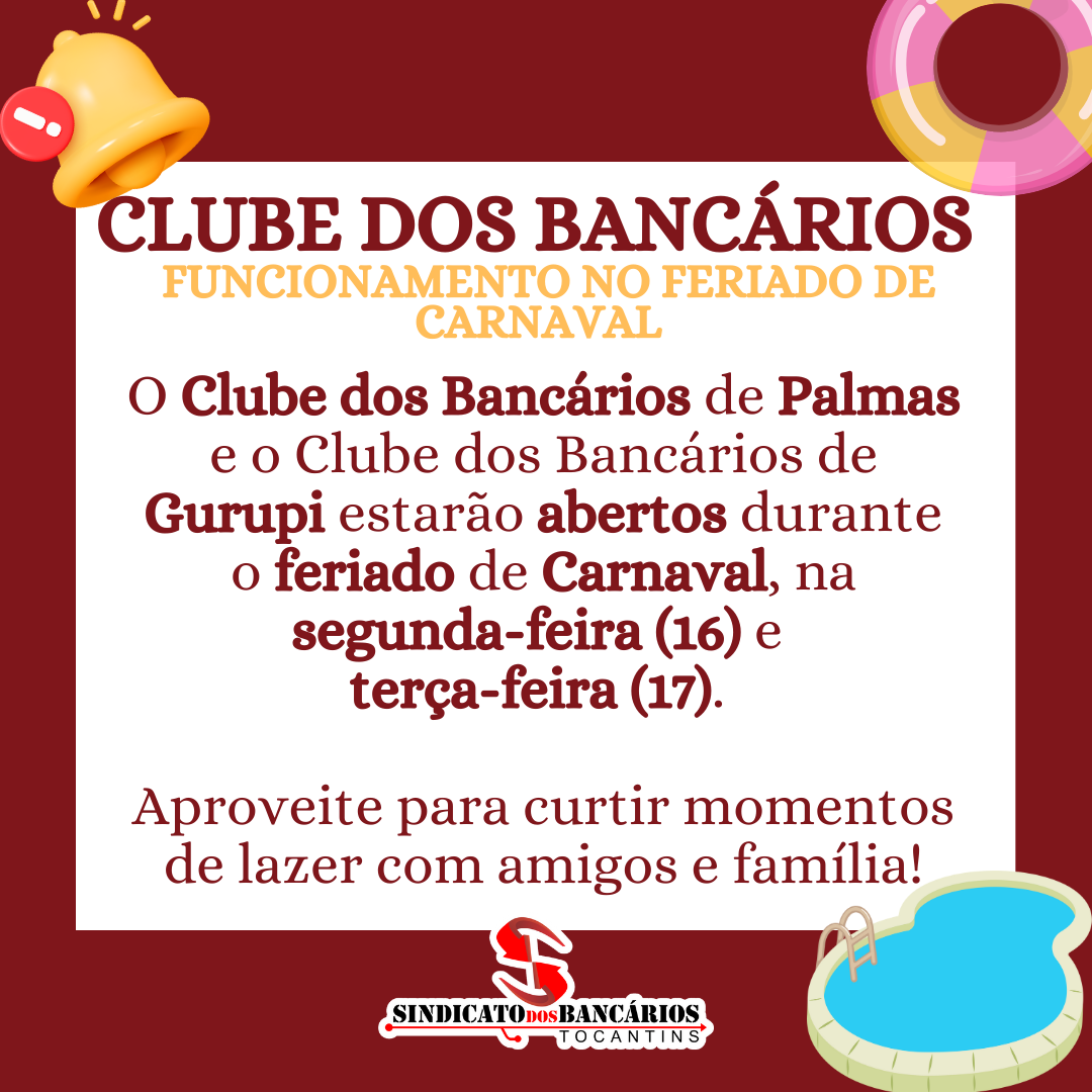 Clube dos Bancários de Palmas e Gurupi funcionarão durante o feriado de Carnaval