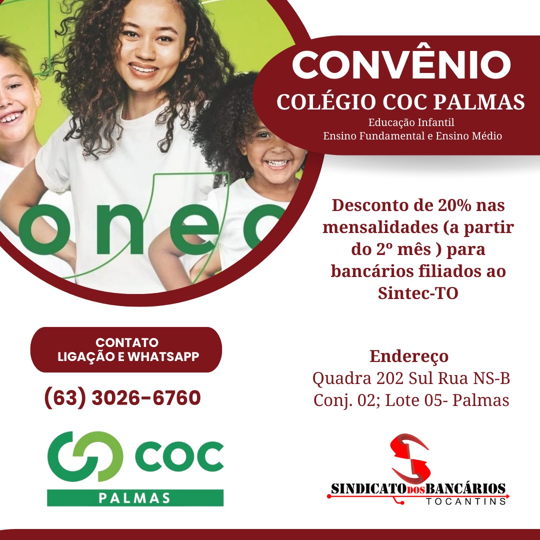 Sindicato firma convênio com Colégio COC Palmas para oferecer descontos aos bancários filiados