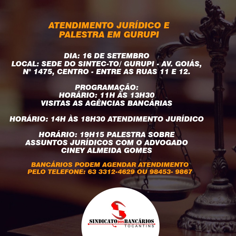 Sintec-TO irá realizar atendimento jurídico e palestra na cidade de Gurupi
