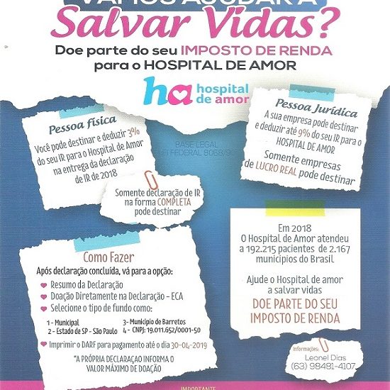 AJUDE A CONSTRUIR O HOSPITAL DE AMOR PALMAS COM O SEU IMPOSTO DE RENDA