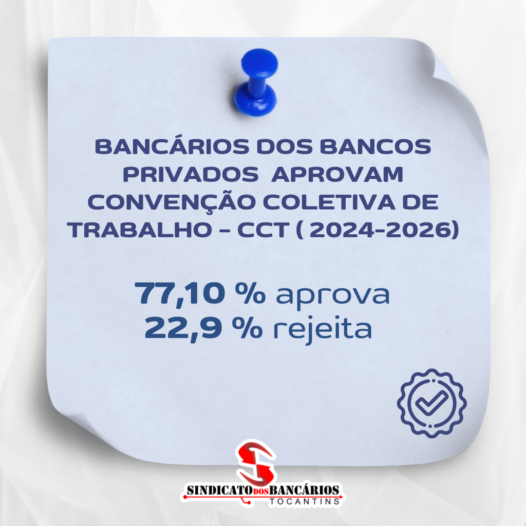 Veja maisOs bancários dos bancos privados do Tocantins aprovaram a Convenção Coletiva de Trabalho (CCT) para o biênio 2024-2026, com 77,10% dos votos a favor e 22,9% contrários. A votação foi realizada nesta segunda-feira, das 10h às 17h, de forma online para os bancários filiados e presencial para os não filiados conforme apresentado em edital.