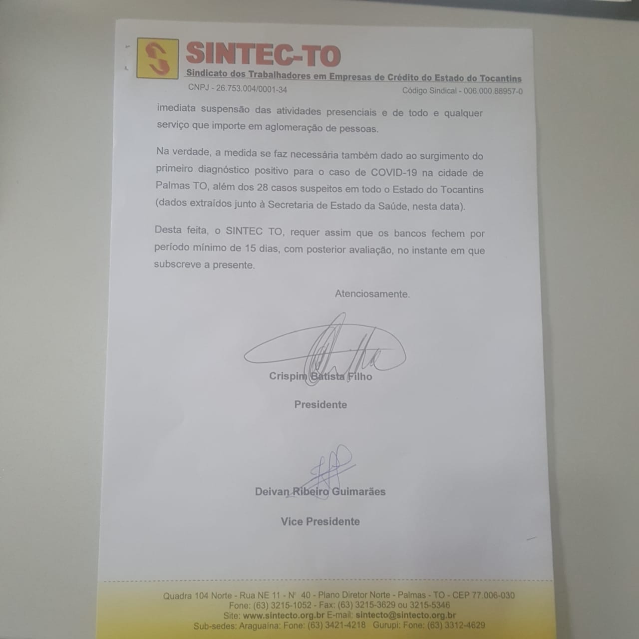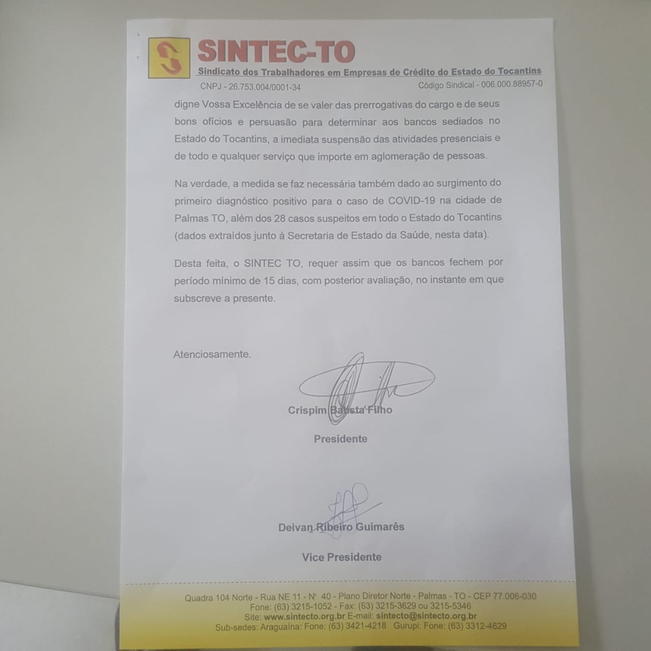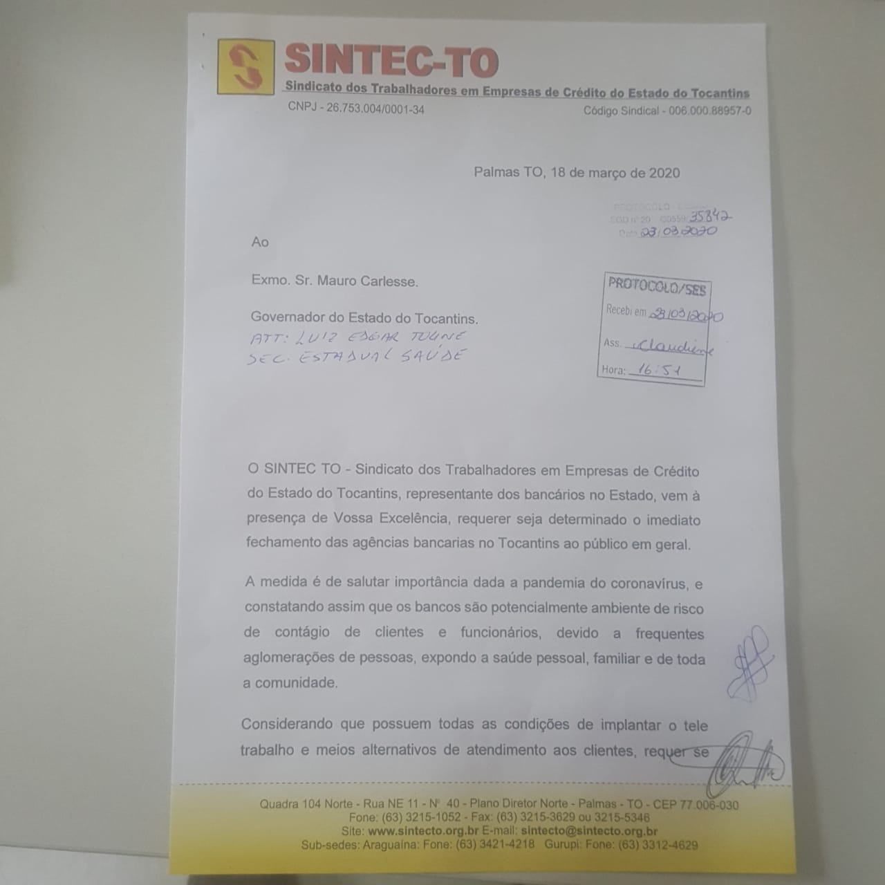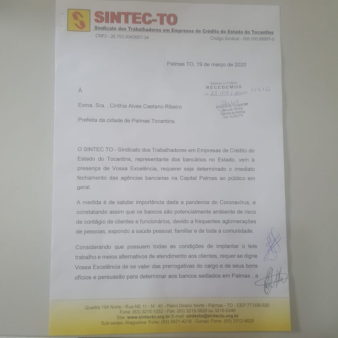 O SINTECTO – Sindicato dos Bancários do Tocantins tem buscado junto às prefeituras municipais e ao governo do estado a sensibilização para a adoção de medidas restritivas de acesso às agências bancárias como forma de proteção dos bancários e do público ao contágio pelo coronavírus.
