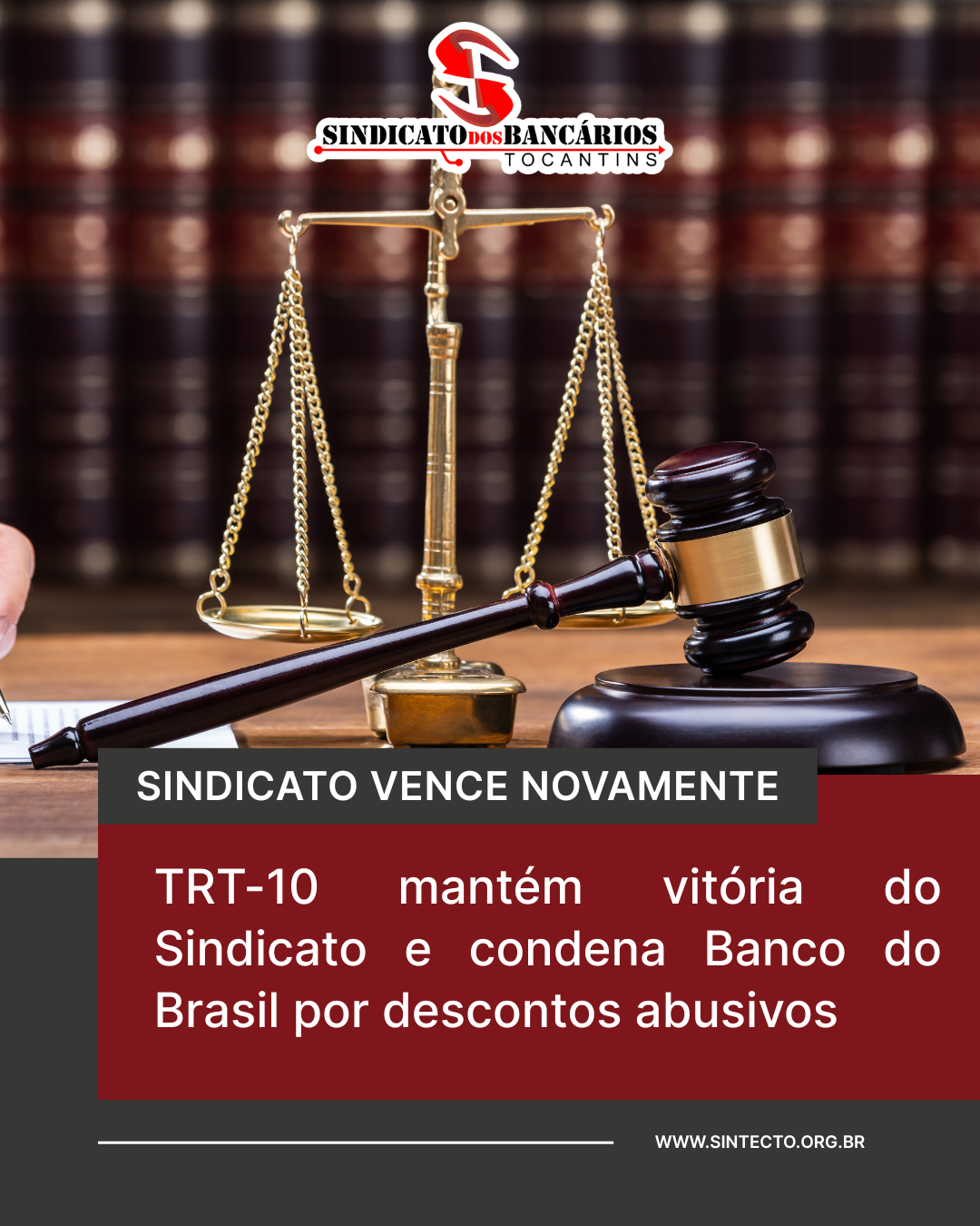 O Sindicato dos Bancários do Tocantins conquistou mais uma importante vitória judicial em defesa de uma bancária do Banco do Brasil. A ação já havia sido julgada procedente na Vara do Trabalho e, em audiência realizada nesta semana, o Tribunal Regional do Trabalho da 10ª Região (TRT-10) manteve a decisão e ainda reformou a sentença para incluir indenização por dano moral, que havia sido negada em primeira instância.